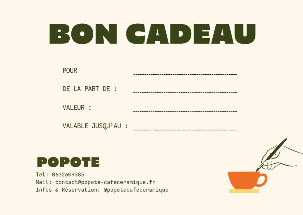 Avec les bons cadeaux Popote, vous offrez un vrai moment de plaisir, un atelier de peinture sur céramique pour s’amuser, se détendre et créer de ses propres mains une pièce unique !
