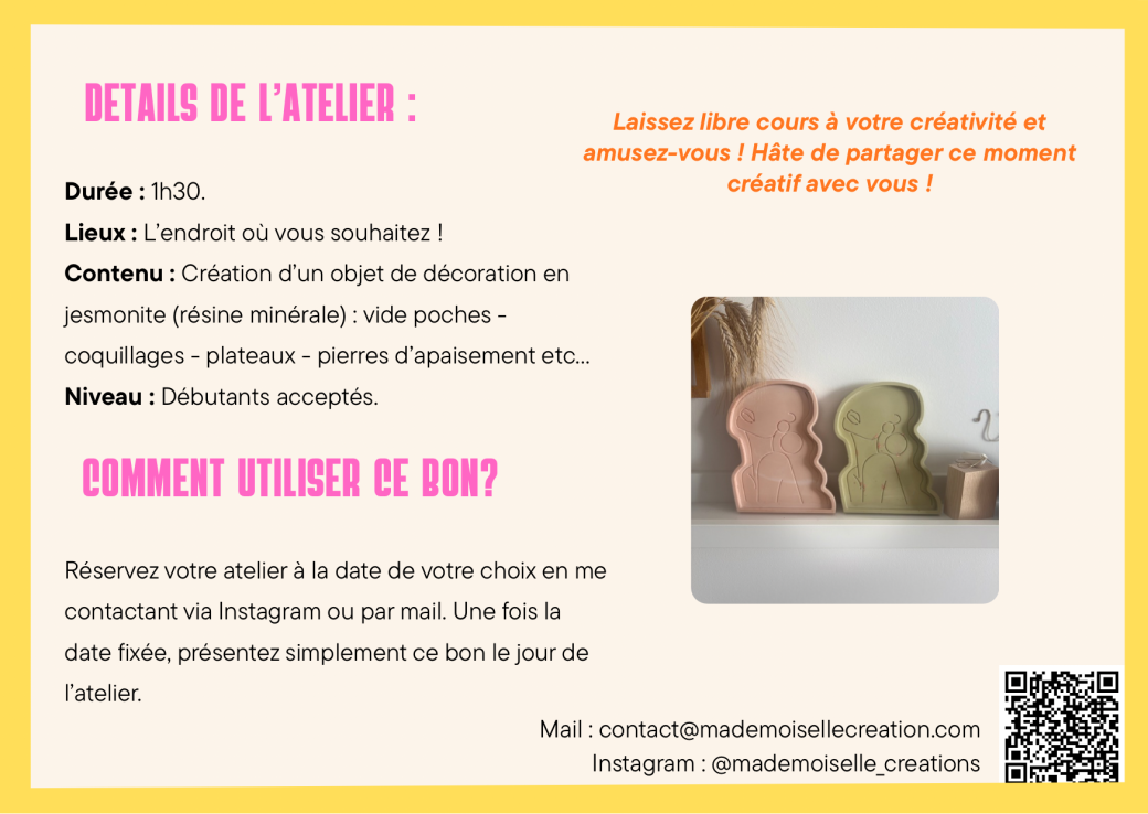 Ce billet vous permet de participer à un atelier jesmonite, vous pourrez choisir la date de votre choix, selon les disponibilités, en me contactant au préalable.