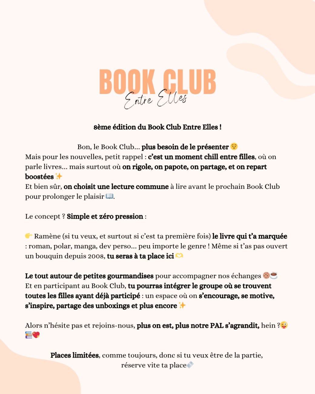 2025-11-09 14:00:00 2025-11-09 17:30:00 Europe/Paris Book Club Entre Elles Reservations on : https://www.billetweb.fr/book-club-entre-elles --                                        ------------------------------   ⚠️ ATTENTION :   En cas d’annulation, le billet ne pourra être remboursé. Cependant, si tu souhaites l'offrir ou le revendre à une copine / sœur / collègue, ceci est possible. Quoi que tu décides, pense à me tenir informé de ta décision. Merci pour ta compréhension & hâte de te retrouver ! ✨ 7VB Café Mulhouse, Place de la République, Mulhouse, France Entre Elles