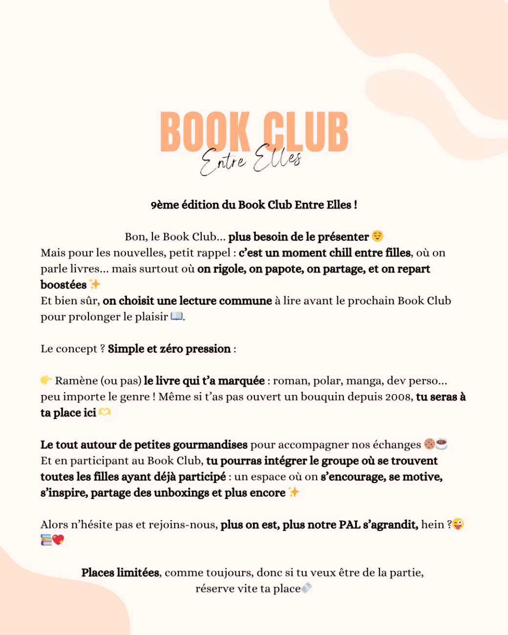2025-12-07 14:00:00 2025-12-07 17:30:00 Europe/Paris Book Club Entre Elles Reservations on : https://www.billetweb.fr/book-club-entre-elles1 --                                        ------------------------------   ⚠️ ATTENTION :   En cas d’annulation, le billet ne pourra être remboursé. Cependant, si tu souhaites l'offrir ou le revendre à une copine / sœur / collègue, ceci est possible. Quoi que tu décides, pense à me tenir informé de ta décision. Merci pour ta compréhension & hâte de te retrouver ! ✨ 7VB Café Mulhouse, Place de la République, Mulhouse, France Entre Elles