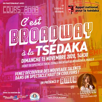2020-11-15 14:30:00 2020-11-15 17:30:00 Europe/Paris C'est Broadway à la Tsédaka Reservations on : https://www.billetweb.fr/broadway-tsedaka2020 -- Venez découvrir des nouveaux talents dans un spectacle haut en couleurs !Chant, danse, théâtre, comédie musicale … Espace Rachi - Guy De Rothschild, Rue Broca, Paris, France Tsédaka FSJU
