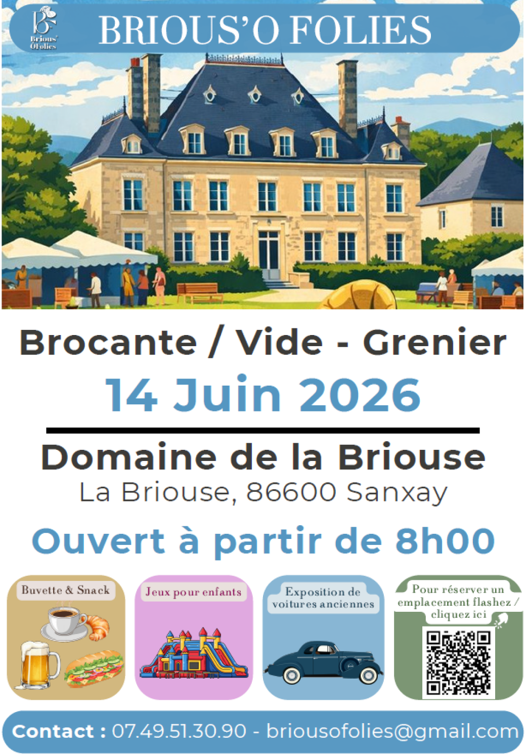 2026-06-14 06:00:00 2026-06-14 19:00:00 Europe/Paris Brocante Domaine de la Briouse Reservations on : https://www.billetweb.fr/brocante-domaine-de-la-briouse -- Un rendez-vous convivial et familial pour chiner, échanger et partager au cœur du Domaine de la Briouse. Une journée placée sous le signe de la rencontre, de la seconde vie des objets et de la bonne humeur locale. DOMAINE DE LA BRIOUSE, La Briouse, Sanxay, France Domaine de la Briouse