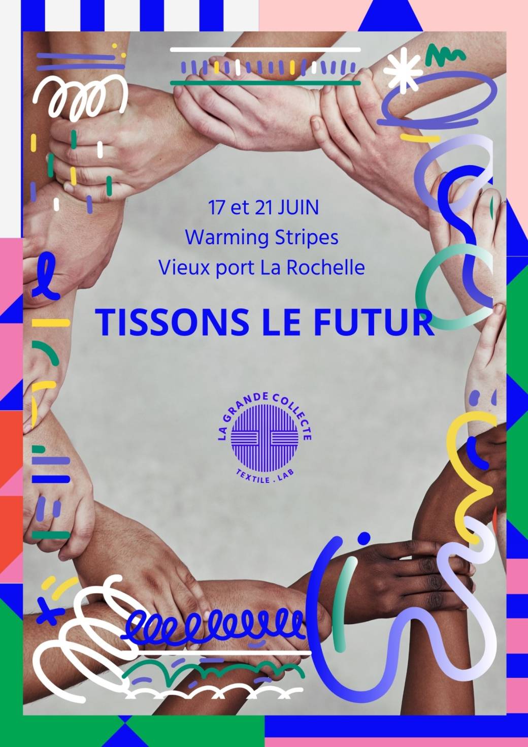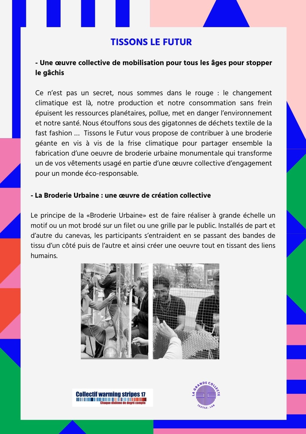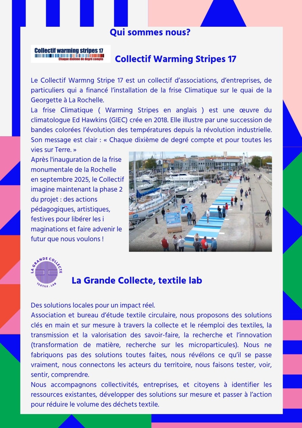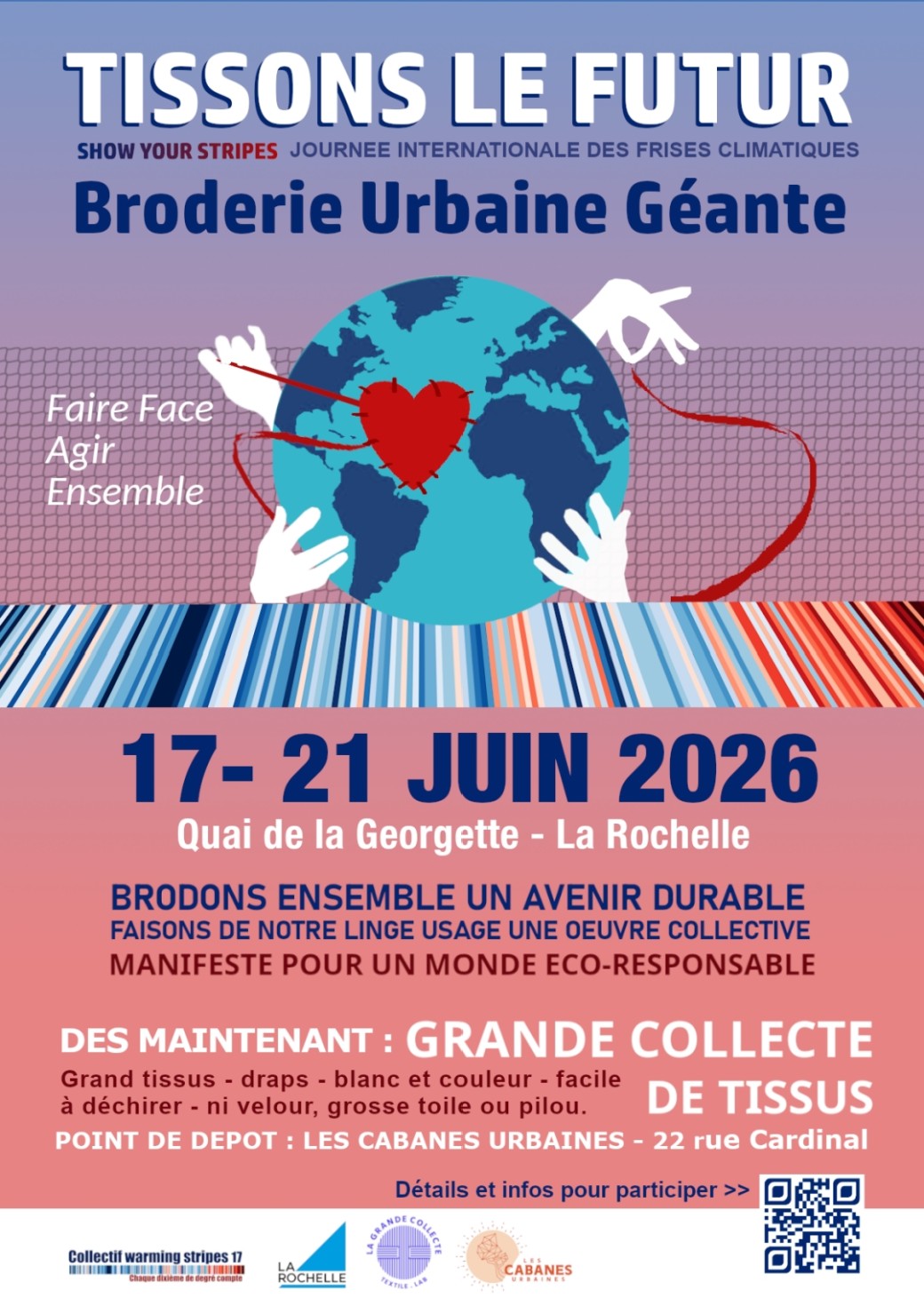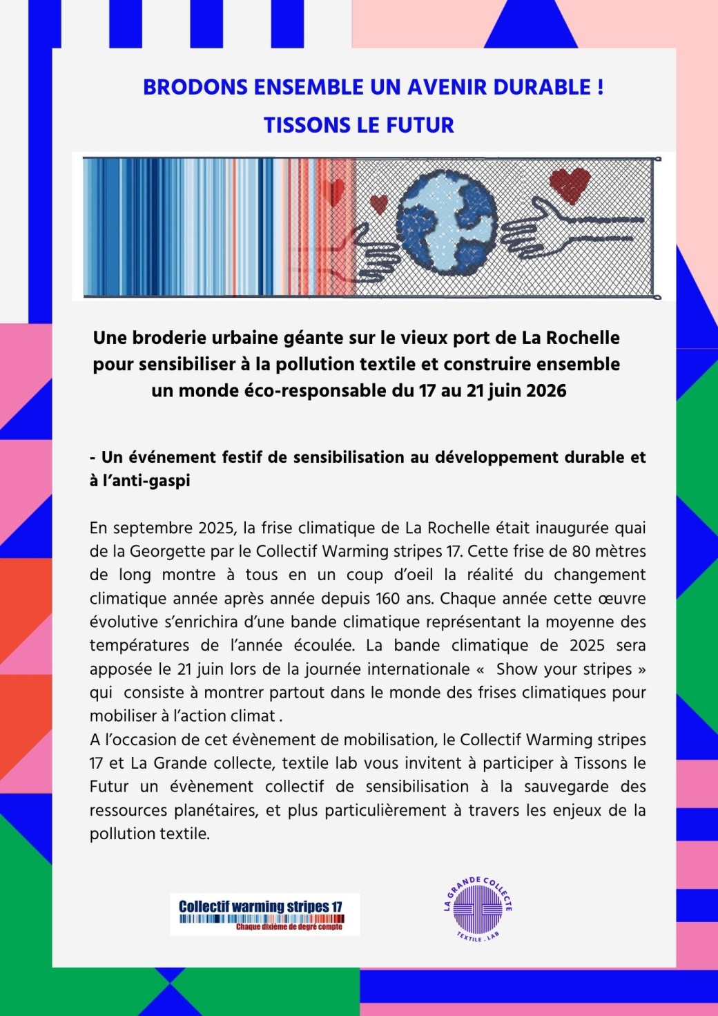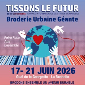 En septembre 2025, la frise climatique de La Rochelle était inaugurée quai de la Georgette par le Collectif Warming stripes 17. Cette frise de 80 mètres de long montre à tous en un coup d’oeil la réalité du changement climatique année après année depuis 160 ans. Chaque année cette œuvre évolutive s’enrichira d’une bande climatique représentant la moyenne des températures de l’année écoulée. La bande climatique de 2025 sera apposée le 21 juin lors de la journée internationale « Show your stripes » qui consiste à montrer partout dans le monde des frises climatiques pour mobiliser à l’action climat . A l’occasion de cet évènement de mobilisation, le Collectif Warming stripes 17 et La Grande collecte, textile lab vous invitent à participer à Tissons le Futur un évènement collectif de sensibilisation à la sauvegarde des ressources planétaires, et plus particulièrement à travers les enjeux de la pollution textile. Un événement festif de sensibilisation au développement durable et à l’anti-gaspi