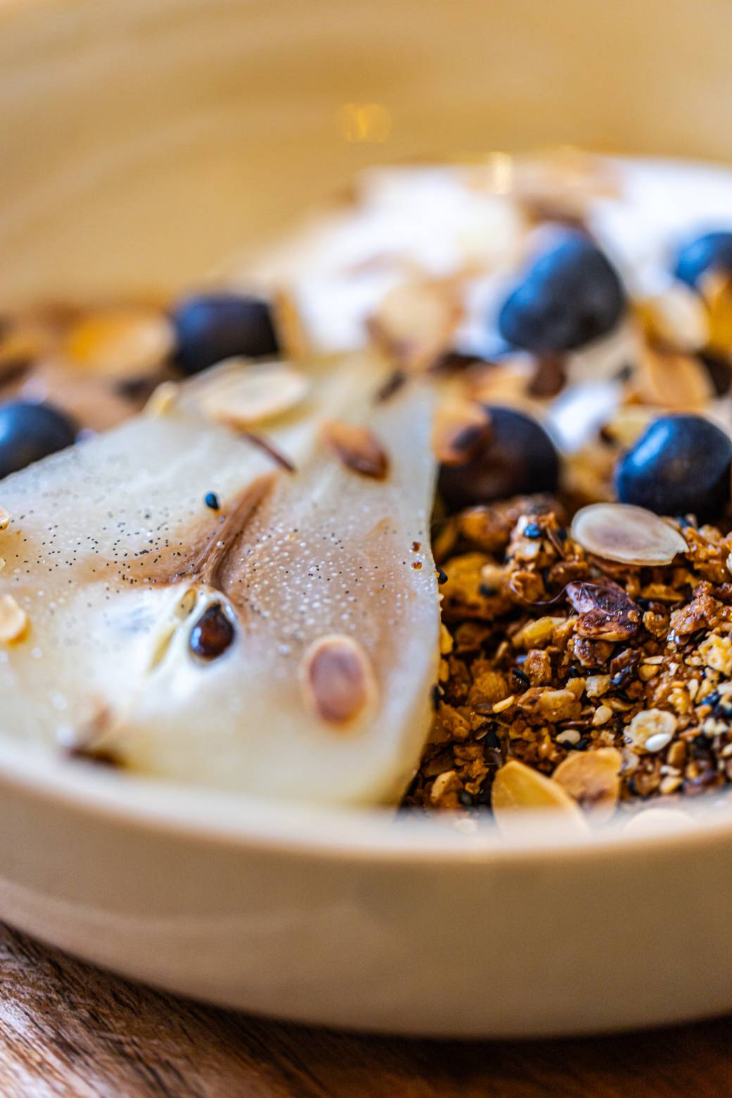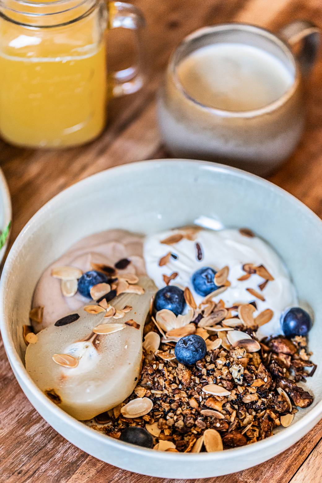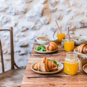 Au menu : une assiette salée (croissant garni*, accompagné d'une salade verte) + une assiette sucrée (un granola maison, poire pochée à la vanille, yahourt, crème de marron) + un grand jus d'oranges ou pommes pressées (au choix) ainsi qu'une boisson parmis nos cafés/thés soigneusement choisis.