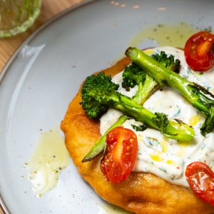 • Langos doré minute, crème aigre végétale et poireaux brûlés