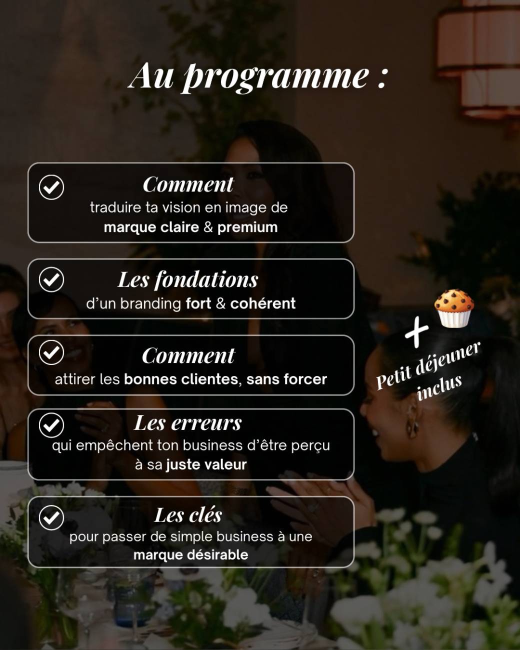 Cet atelier vous aidera à clarifier votre positionnement, structurer votre communication et construire une marque forte et cohérente. C'est aussi un véritable levier de réseautage : un moment privilégié pour rencontrer d’autres femmes entrepreneures, créer des synergies et développer votre réseau dans une ambiance conviviale.