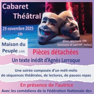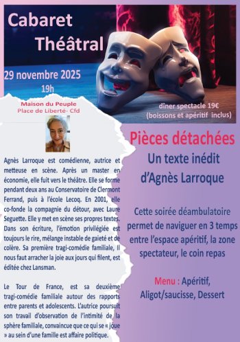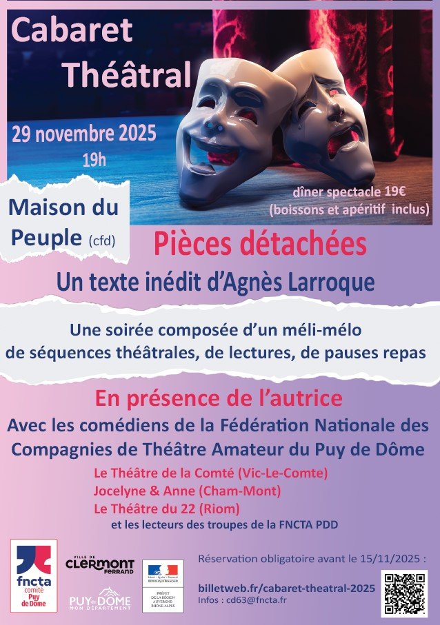 2025-11-29 19:00:00 2025-11-29 23:30:00 Europe/Paris Cabaret Théâtral Reservations on : https://www.billetweb.fr/cabaret-theatral-2025 -- Pièces Détachées un texte inédit d' Agnès Larroque   avec les comédiens de la Fédération Nationale des Compagnies de Théâtre Amateur du Puy De Dôme   au cours d'une soirée conviviale en présence de l'autrice composée d'une méli-mélo de séquences théâtrales, de lectures, de pauses repas.   "Pièces détachées" nous parle de notre avenir... En compagnie d'Agnès Larroque, au travers de son regard et de son humour caustique, nous sommes assurés de passer un agréable moment à découvrir ce que les évolutions technologiques nous promettent !   La soirée est découpée en 3 temps où le spectateur est invité à se déplacer entre les différents espaces (repas, spectacle) Apéritif  Aligot / saucisse Pâtisserie Maison du Peuple, Place de la Liberté, Clermont-Ferrand, France Comité FNCTA PDD
