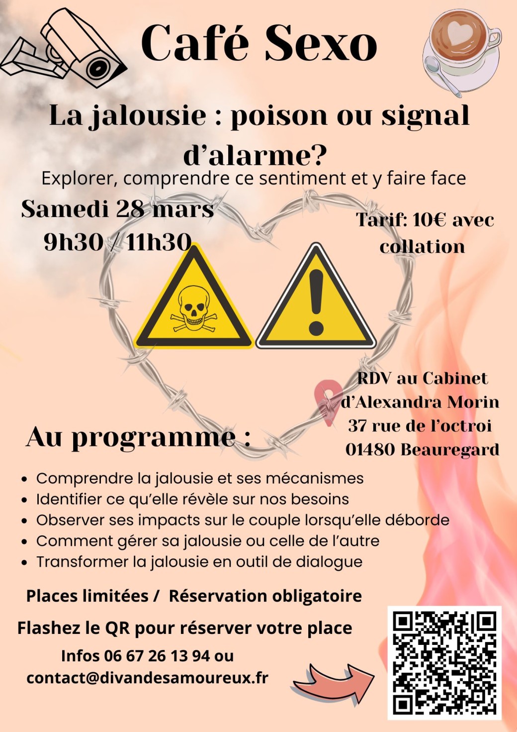 2026-03-28 09:30:00 2026-03-28 11:30:00 Europe/Paris Café sexo : la jalousie, poison ou signal d'alarme ? Reservations on : https://www.billetweb.fr/cafe-sexo-la-jalousie-poison-ou-signal-dalarme -- Saisissez votre description La jalousie : poison ou signal d’alarme ? La jalousie n’est pas une faiblesse. C’est une émotion. Mais lorsqu’elle prend trop de place, elle peut fragiliser la confiance, créer des tensions et installer des malentendus. Et si on apprenait à l’écouter autrement ? Au programme : Comprendre l’origine de la jalousie Différencier intuition, insécurité et contrôle Apprendre à en parler sans blesser Retrouver sécurité et apaisement dans le couple Un espace confidentiel, respectueux et humain pour déposer, comprendre et transformer. Places limitées / inscription obligatoire Le divan des amoureux, Rue de l'Octroi, Beauregard, France Alexandra MORIN EI