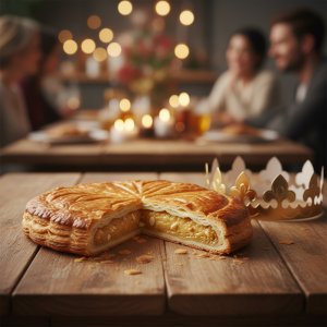 There will be several galettes, so there will be more than one king and queen. We will sit together, cut the galettes, and share them around the table while talking and enjoying the moment.