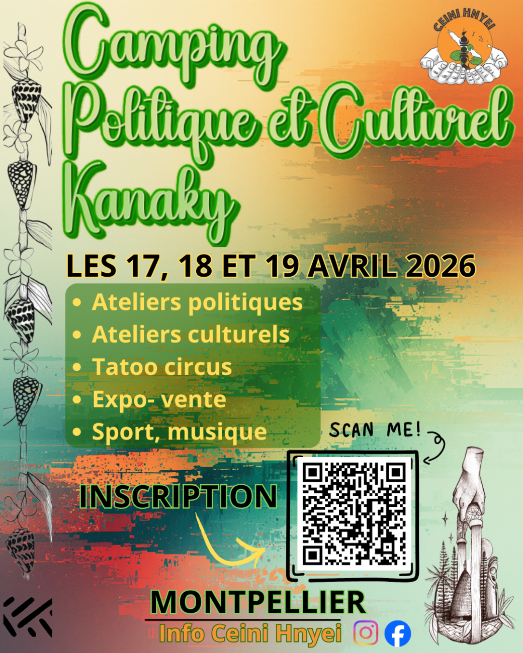 Le camping sera ouvert à l’installation jeudi 16 avril à partir de 18h. Les matinées et les soirées seront animées par des conférences politiques et les après-midi par des ateliers culturels kanak. Un tatoo circus sera également présent pour vous faire de beaux percings et/ou des tatouages à prix libre. Soyez au rendez-vous pour cette quatrième édition.