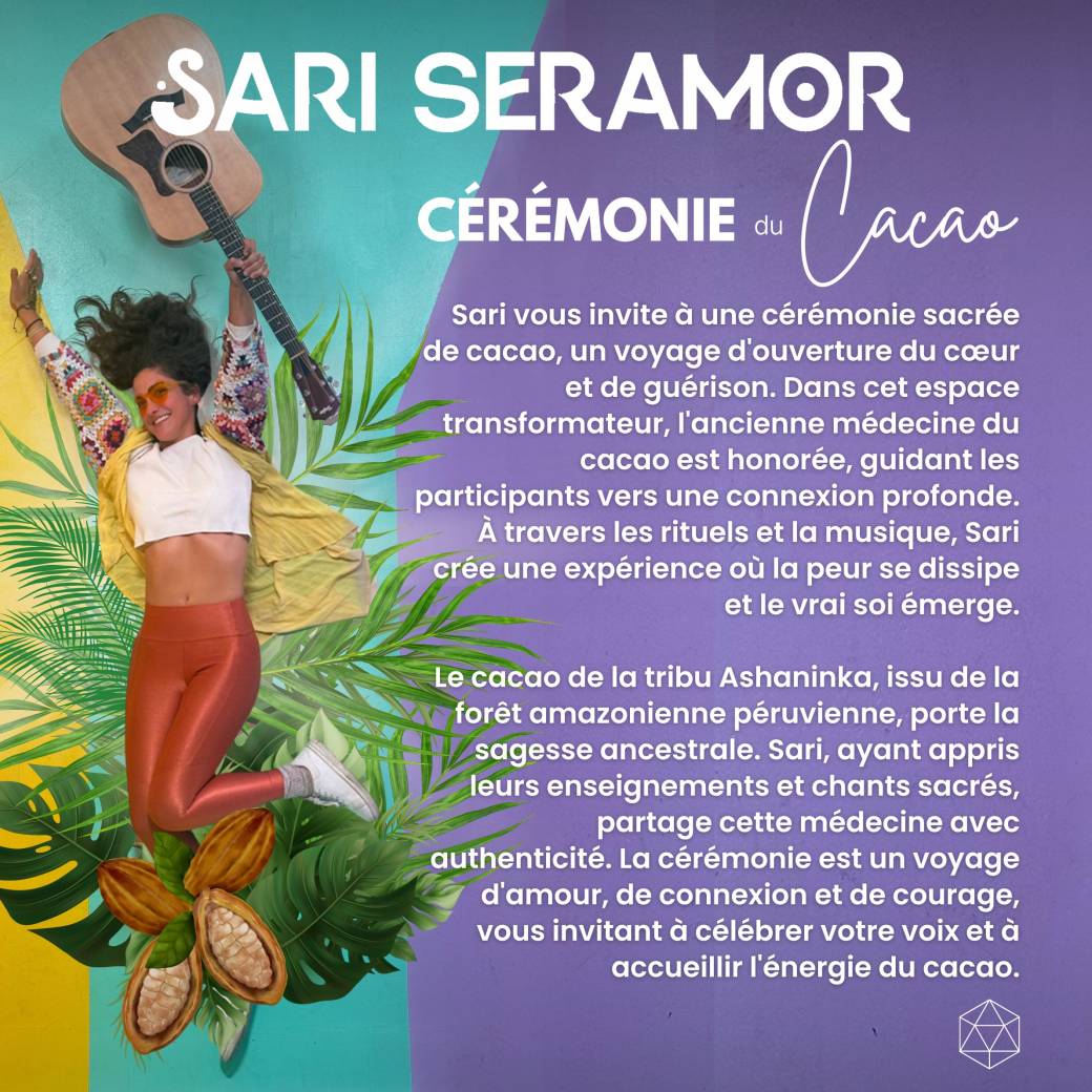 Portant les enseignements sacrés du cacao, elle partage cette médecine ancestrale comme une clé d’ouverture du cœur et de transformation intérieure. À travers sa musique et ses cérémonies, elle invite chacun à embrasser sa vulnérabilité, à retrouver sa force intérieure et à se reconnecter à l’amour universel.