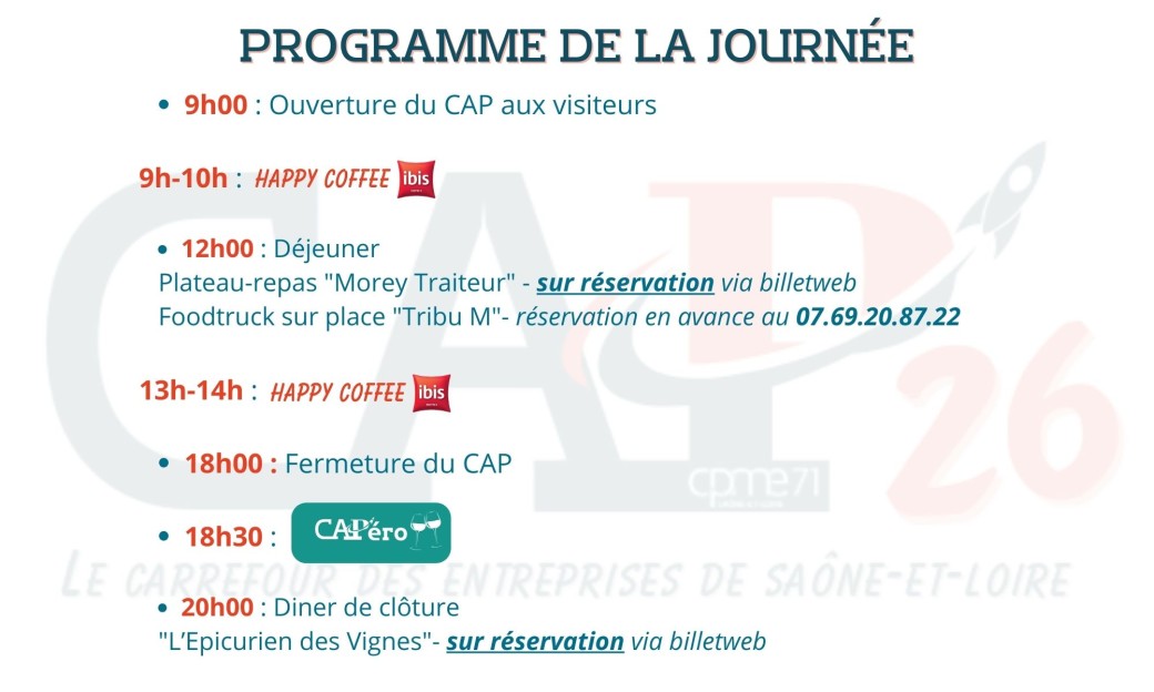 2026-06-04 09:00:00 2026-06-04 23:55:00 Europe/Paris CAP 26 Reservations on : https://www.billetweb.fr/cap-26 -- *Pour la restauration : Nous indiquer si contraintes alimentaires à : cap@cpme-71.fr   *Retrouvez toutes les infos sur : Site officiel du CAP26    *Questions : Contactez-nous   cap@cpme-71.fr 03.85.42.96.44   Merci de présenter "MonbilletCAP26" au format papier ou numérique à l'entrée de l'événement c'est OBLIGATOIRE ! Parc des Expositions de Chalon-sur-Saône, Rue d'Amsterdam France CPME 71