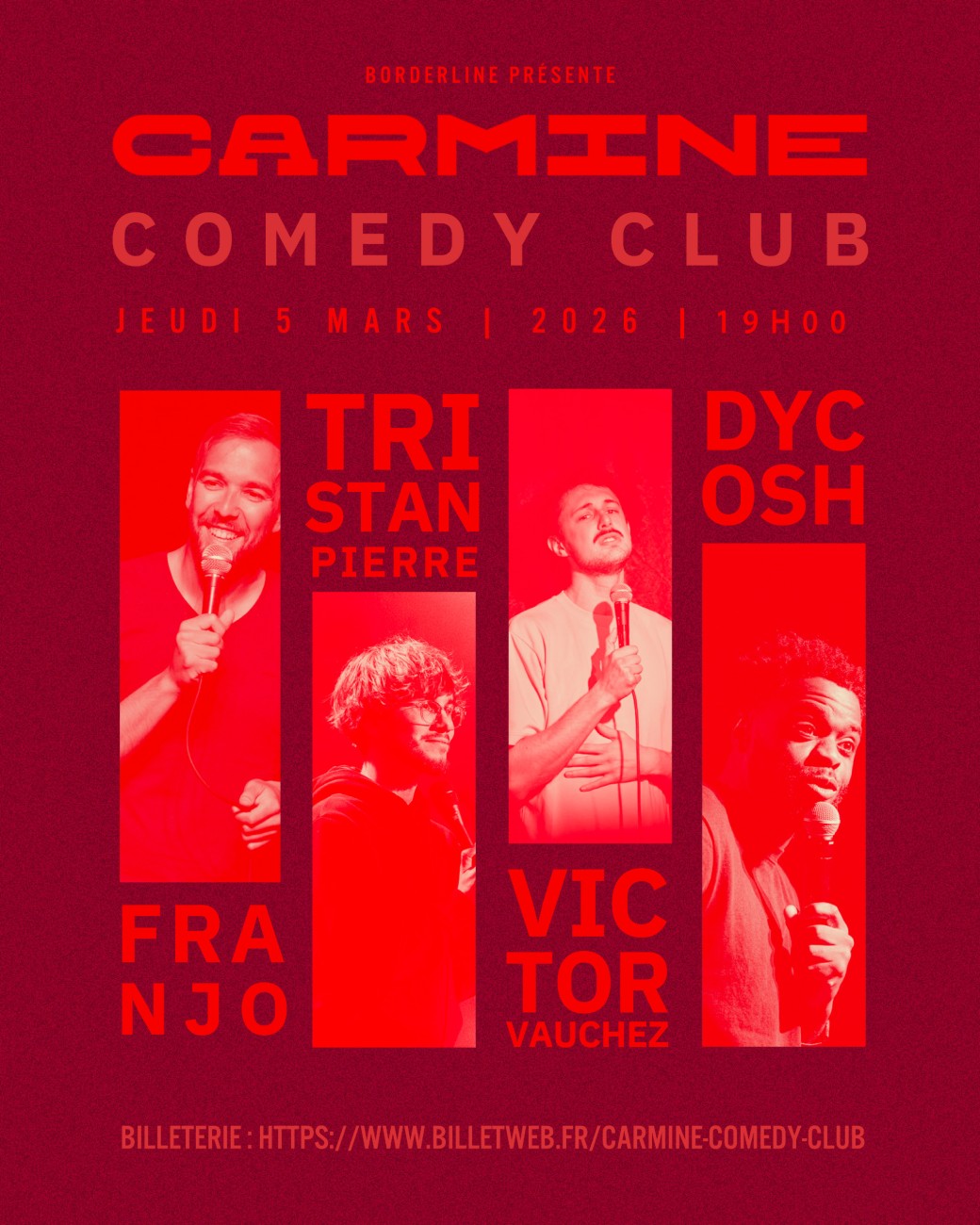 2026-03-05 19:00:00 2026-03-05 20:00:00 Europe/Paris Carmine Comedy Club Reservations on : https://www.billetweb.fr/carmine-comedy-club3 -- Le Carmine Comedy Club revient pour son sixième plateau de stand-up, et ça promet d’être le feu ! Quatre artistes, aux univers bien distincts, habitués des scènes mythiques du Paname Comedy Club, The Joke, Golden Comedy Club, Fridge Comedy Club, etc., monteront sur scène pour vous offrir une soirée pleine de rires, d’énergie et de surprises. Venez découvrir : @franjoreno : Franjo monte sur scène avec une énergie sincère et une écriture précise, mêlant autodérision et regard aiguisé sur le monde qui l’entoure. Il raconte le quotidien avec justesse, toujours à la frontière entre le rire franc et l’observation fine. @tristanxpierre : Tristan développe un humour instinctif et décalé, où l’absurde se glisse naturellement dans le réel. Sur scène, il surprend par sa liberté de ton et son sens du décalage, créant une vraie complicité avec le public. @victorvauchez : Victor explore nos petites failles et grandes contradictions avec un humour mordant et une présence scénique affirm… Carmine, Avenue du Touring Club, Hossegor, France Carmine Bar - Borderline Productions