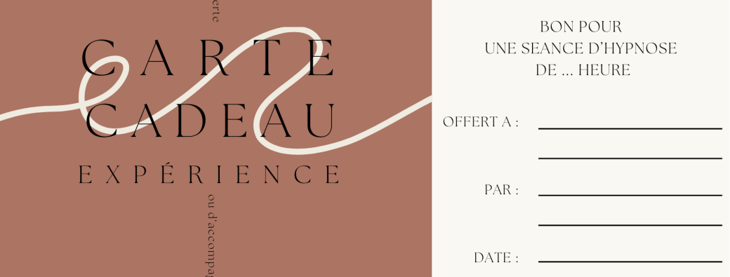 2025-02-14 00:00:00 2025-08-31 00:00:00 Europe/Paris Carte cadeau "Expérience hypnose" 1h30 Reservations on : https://www.billetweb.fr/carte-cadeau-experience-hypnose-1h30 -- Cette carte cadeau vous est offerte par des gens qui tiennent à vous.  Pour réserver votre séance d'hypnose, merci de scanner le QR code intégré à la carte et de réserver votre ou vos créneaux directement dans notre agenda en ligne Calendly. (Scannez avant chaque séance offerte afin de réserver le nombre de séances offertes). Au plaisir de vous faire (re) découvrir l'hypnose. A bientôt - Isabelle Boutoille EI