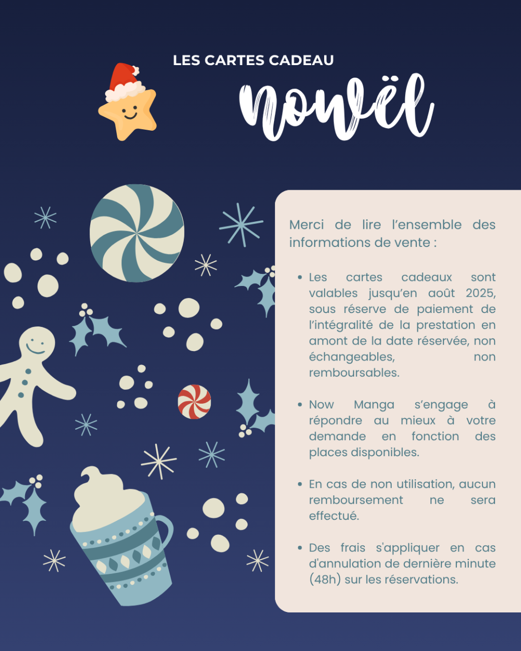 La carte cadeau est valable jusqu'à juillet 2026 inclus, sur nos différentes prestations.