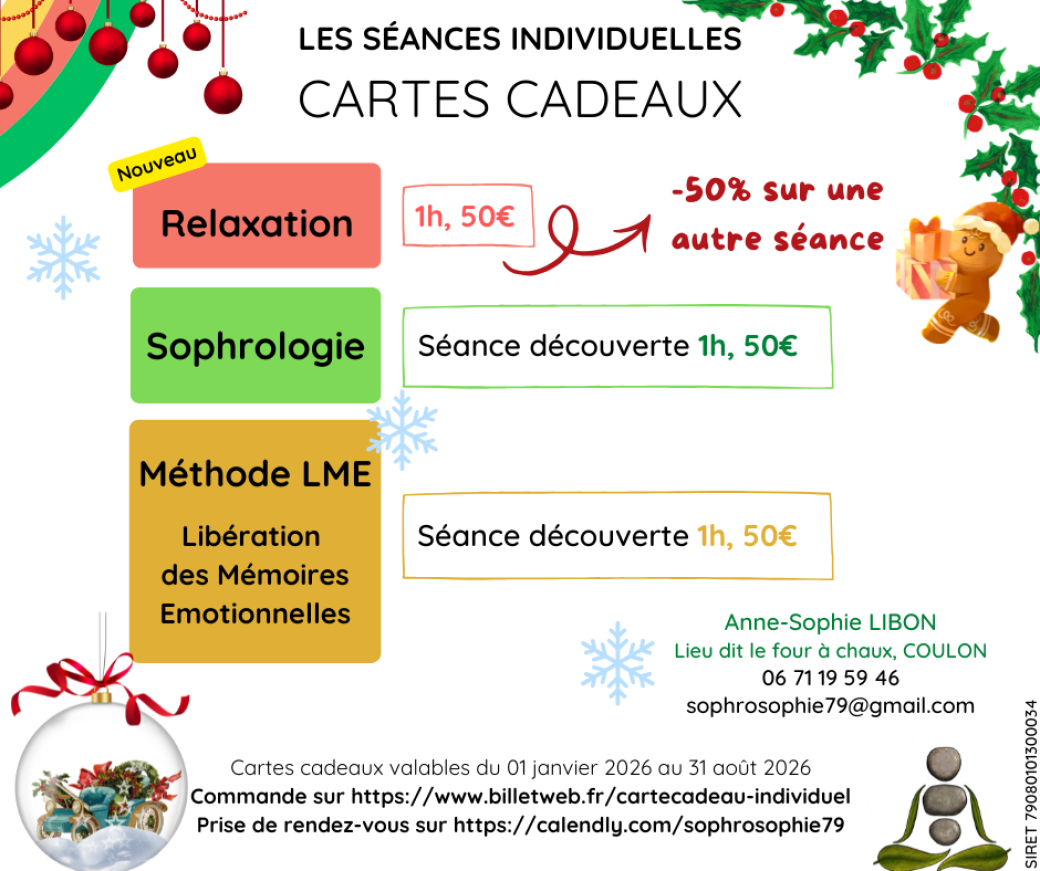 Pour l'achat d'au moins une carte cadeau de ma nouvelle prestation - séance de RELAXATION en individuel au cabinet à Coulon - vous recevrez sous 48h un code de réduction de 50% valable sur une séance (au choix entre séance de découverte LME, séance de découverte Sophrologie, séance de suivi Sophrologie, séance de Relaxation en individuel, carte cadeau).