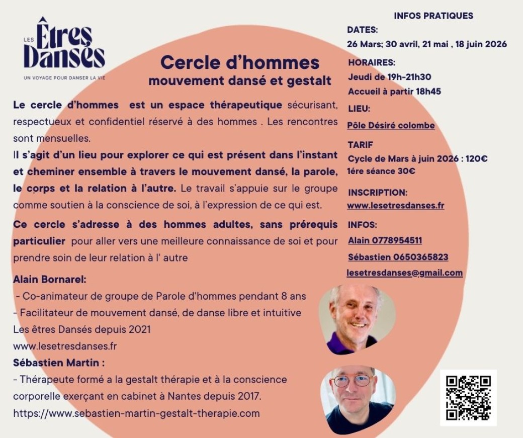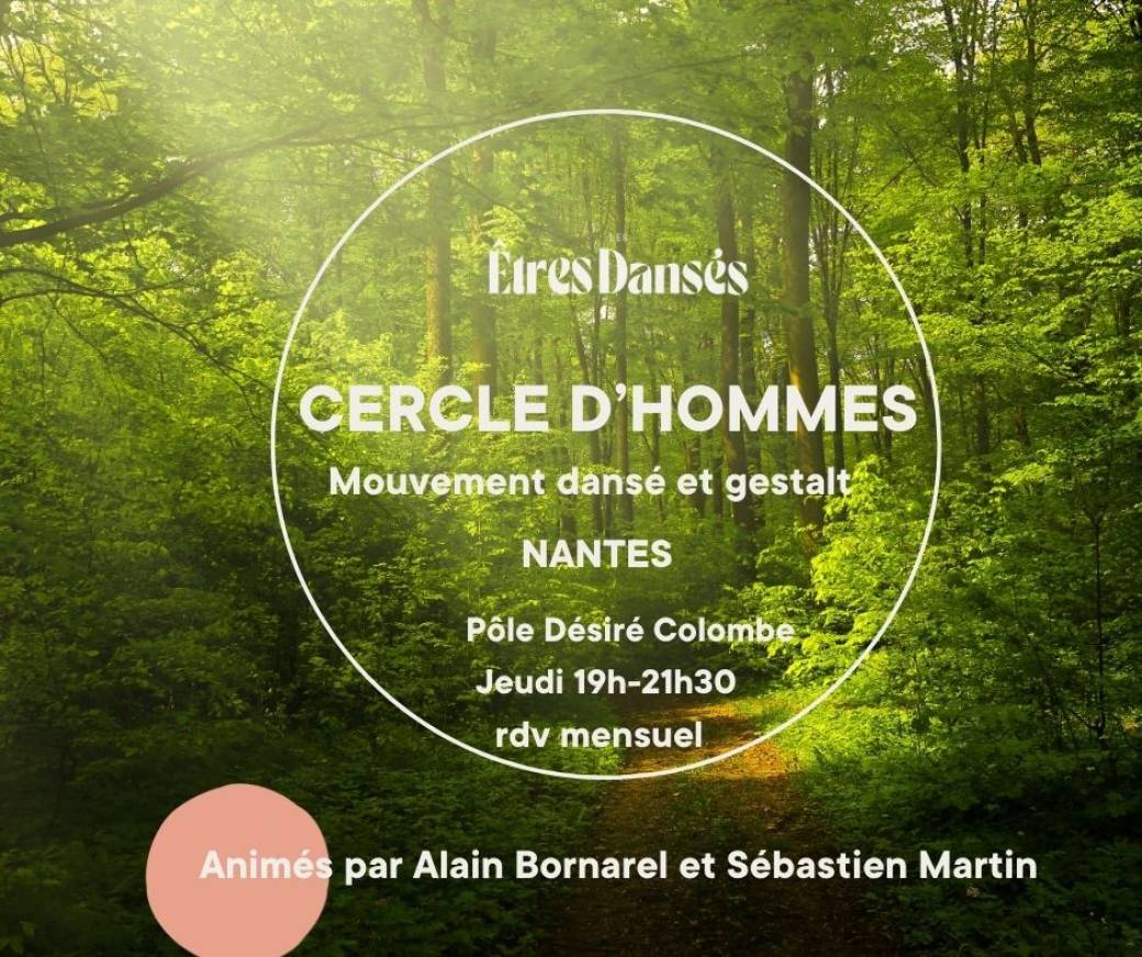 2026-03-26 19:00:00 2026-03-26 21:30:00 Europe/Paris Cercle d'Hommes - Mouvement dansé et gestalt Reservations on : https://www.billetweb.fr/cercle-dhommes-danse-et-gelstat-les-tres-danses-portes-ouvertes-au-groupe-continu-du-jeudi -- Cercle d’Hommes - Mouvement Dansé & Gestalt   Le cercle d’hommes est un espace thérapeutique, sécurisant, respectueux et confidentiel réservé à des hommes . Les rencontres sont mensuelles.   Il s’agit d’un lieu pour explorer ce qui est présent dans l’instant et cheminer ensemble à travers le mouvement dansé, la parole, le corps et la relation à l’autre. Le travail s’appuie sur le groupe comme soutien à la conscience de soi, à l’expression de ce qui est.   Ce cercle a pour intention de soutenir: - une meilleure conscience de soi et de son vécu corporel - une parole authentique, engagée et responsable - la présence à soi et aux autres   Le cadre est essentiel pour que chacun puisse oser l'exploration en toute sécurité. Cela repose sur: - la confidentialité - le non-jugement, - l’écoute et le respect du rythme de chacun - l’engagement   Pour qui  Ce cercle s’adresse à des hommes adultes, sans prérequis particulier, ayant le désir de se mettre en mouvement entre hommes pour aller vers un… Pôle associatif Désiré Colombe, 8 Rue Arsène Leloup, 44100 Nantes, France Alain Bornarel - Association Les Êtres Dansés