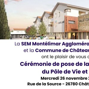 La SEM Montélimar Agglomération Développement et la Commune de Châteauneuf-du-Rhône ont le plaisir de vous convier à la cérémonie de pose de la première pierre du Pôle de Vie et de Santé à Rue de la Source à Châteauneuf-du-Rhône.