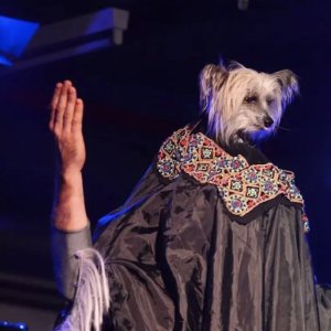 un spectacle de clown–canin belge, qui mêle dressage, humour, chant, jonglage et flûtes.