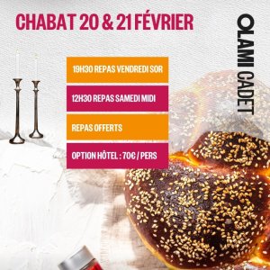 2026-02-20 19:30:00 2026-02-21 20:00:00 Europe/Paris Chabat 20 & 21 février à Olami Cadet Reservations on : https://www.billetweb.fr/chabat-20-21-fevrier-a-olami-cadet -- Chabat 20 et 21 février au centre Olami Cadet  Repas offerts avec possibilité d'hébergement 70€ par personne.  19h30 : repas vendredi soir  12h30 : repas samedi midi  Pour les 20-30 ans  Inscription souhaitée : olami-cadet-nation.fr Olami Cadet Olami Cadet