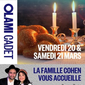 2026-03-20 19:30:00 2026-03-21 20:00:00 Europe/Paris Chabat 20 & 21 mars Reservations on : https://www.billetweb.fr/chabat-20-21-mars -- Chabat exceptionnel avec la famille Cohen au centre Olami Cadet ! Repas offerts avec possibilité d'hébergement 70€ par personne.  19h30 : repas vendredi soir  12h30 : repas samedi midi  Pour les 20-30 ans  Inscription souhaitée : olami-cadet-nation.fr Olami Cadet Olami Cadet