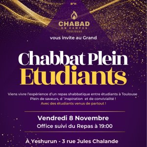 Reservations on : https://www.billetweb.fr/chabbat-plein-tudiantes-toulouse -- https://www.instagram.com/chabadoncampus.toulouse?igsh=MTM4dDNzanc4Z3Q1ZQ%3D%3D&utm_source=qr