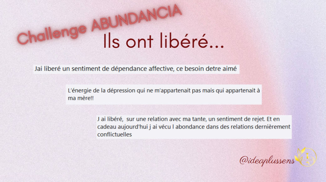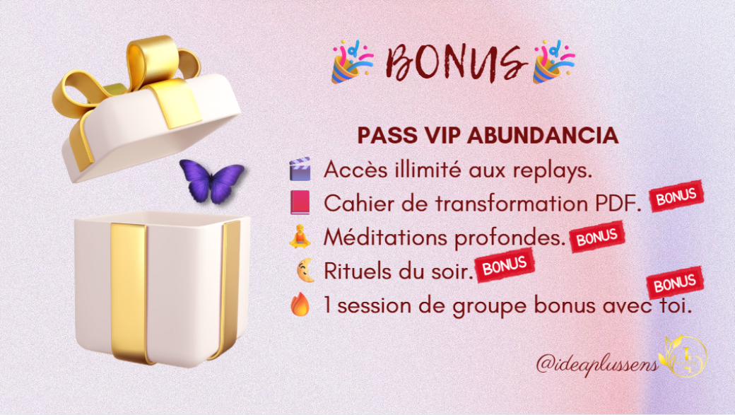 Reservations on : https://www.billetweb.fr/challenge-abundancia-pass-vip1 -- L'“expérience VIP Abundancia” (option payante à 197€) : Tarif spécial Challenge: 47€ jusqu'au 16/10/2025 - Accès illimité aux replays. - Cahier de transformation PDF. - Méditations profondes. - 1 session de groupe bonus avec toi. -Nadine d'Idea+ Sens