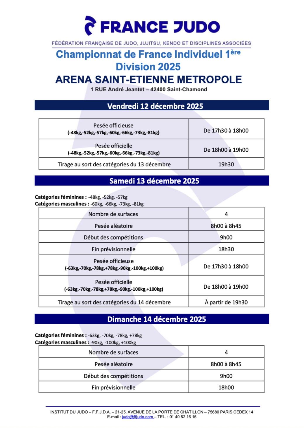 Retrouvez le programme complet du championnat sur notre site internet : ffjudo.com ou en dessous des séances et tarifs.