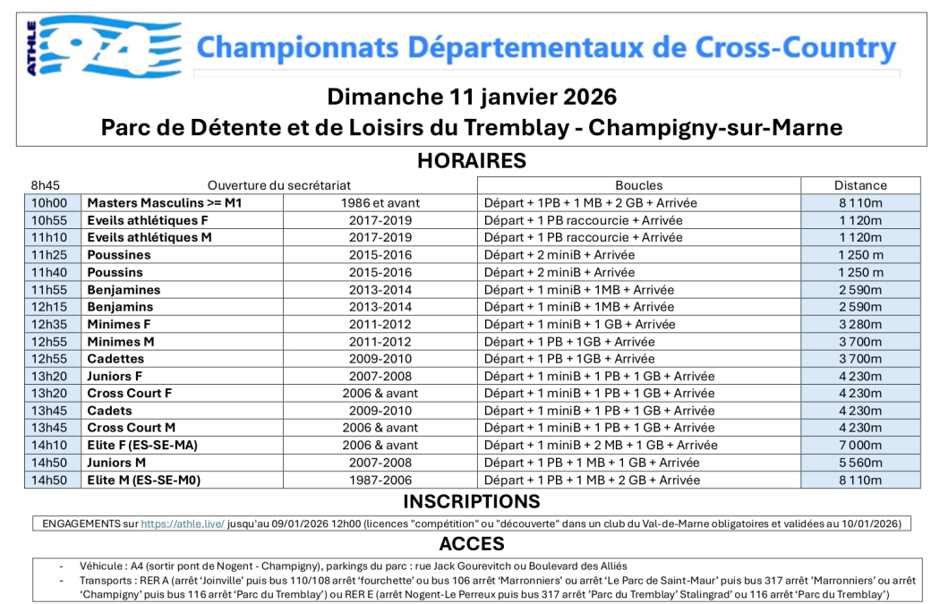 Vous êtes sur la page des inscritions au Championnat du Val de Marne de cross (aka cross du Tremblay depuis des années), le cross le plus important de l'année pour bon nombre d'entre vous !
