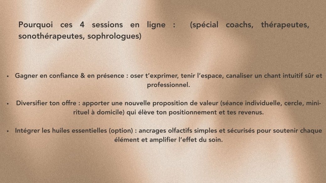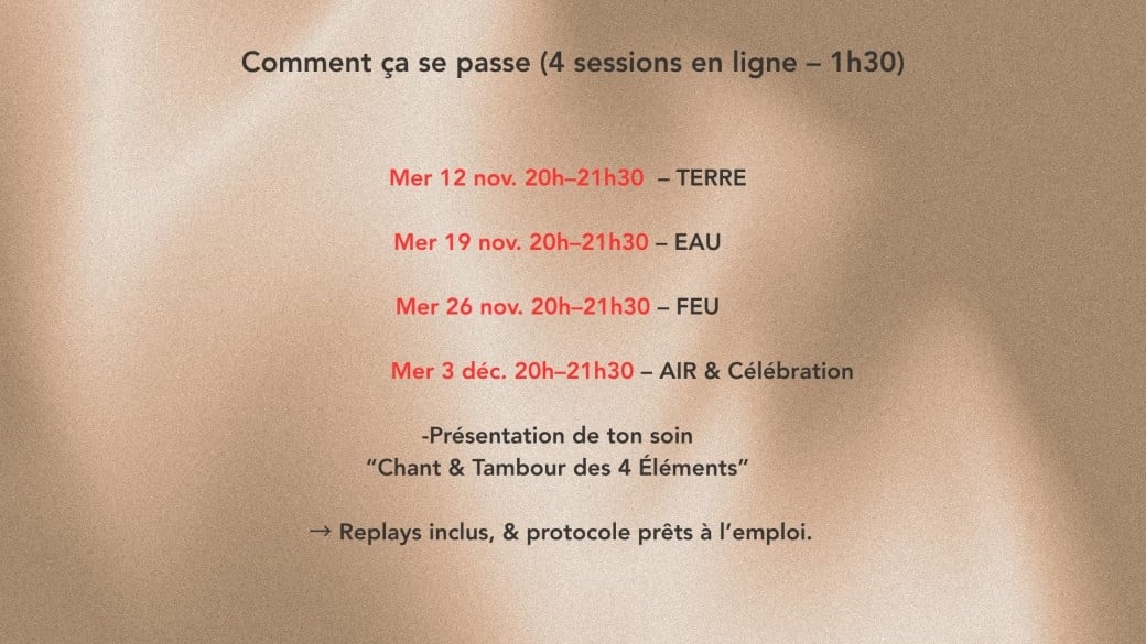 2025-11-12 20:00:00 2025-12-03 21:30:00 Europe/Paris Chant médecine et 4 éléments ( Quand ta voix devient soin ) Reservations on : https://www.billetweb.fr/chant-medecine-et-4-elements-quand-ta-voix-devient-soin -- Bienvenue dans ces 4 sessions en ligne pour développer ta voix avec ton tambour en lien avec les 4 éléments... - celine peltier EI