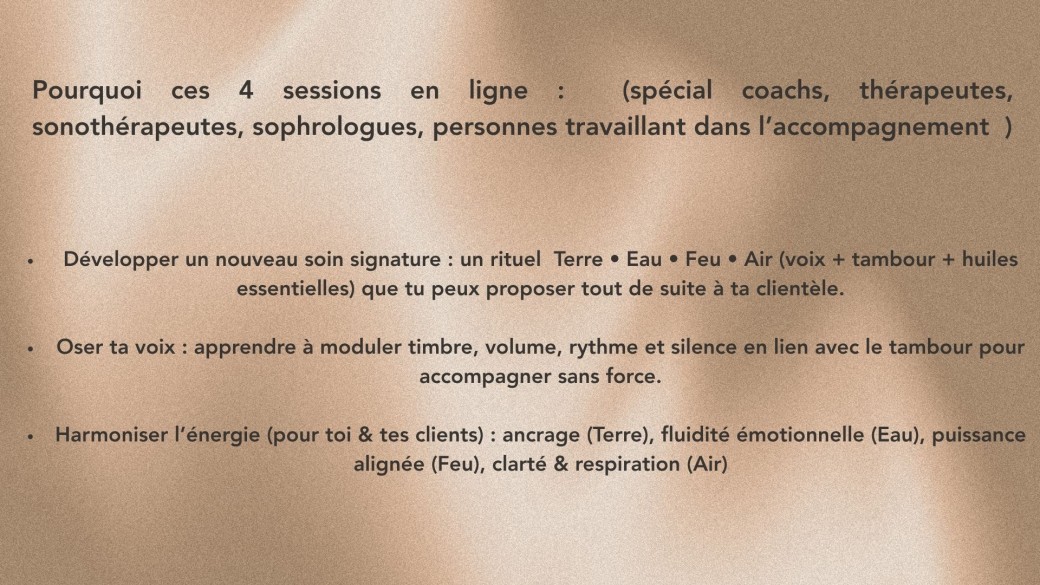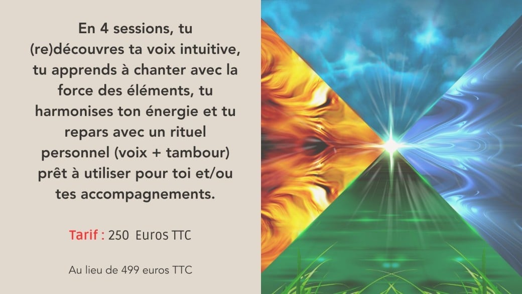Bienvenue dans ces 4 sessions en ligne pour développer ta voix avec ton tambour en lien avec les 4 éléments...