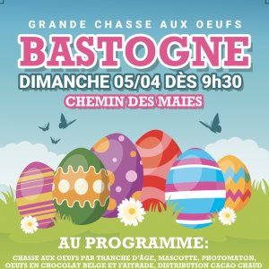 Ce dimanche 5 avril 2026 dès 9h30, la commune de Bastogne vous donne rendez-vous dans le parc à l’arrière de la maison de repos « L’Age d’Or » - (Chemin des Maies) pour une matinée magique et pleine de surprises à l’occasion de notre Grande Chasse aux Œufs !