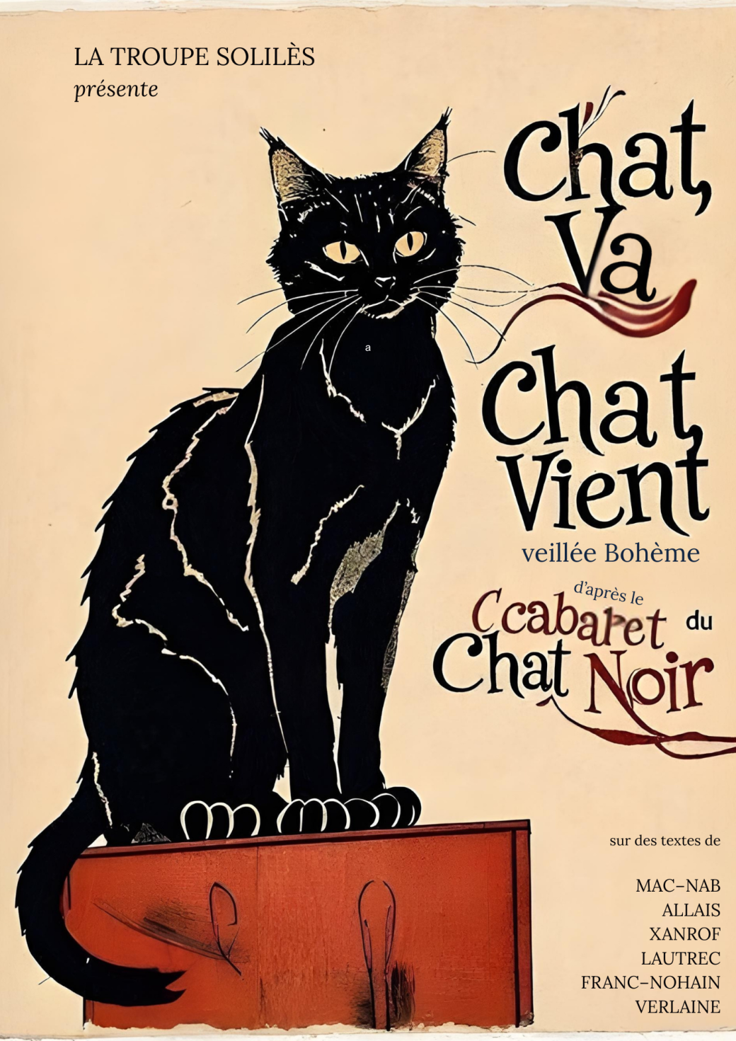 C’est une veillée à l’image du célèbre Cabaret du Chat Noir. La Troupe Solilès ressuscite cet esprit de liberté : un va-et-vient permanent sur scène où quatre comédiens s’emparent de l’espace pour dire, lire, rire et chanter.