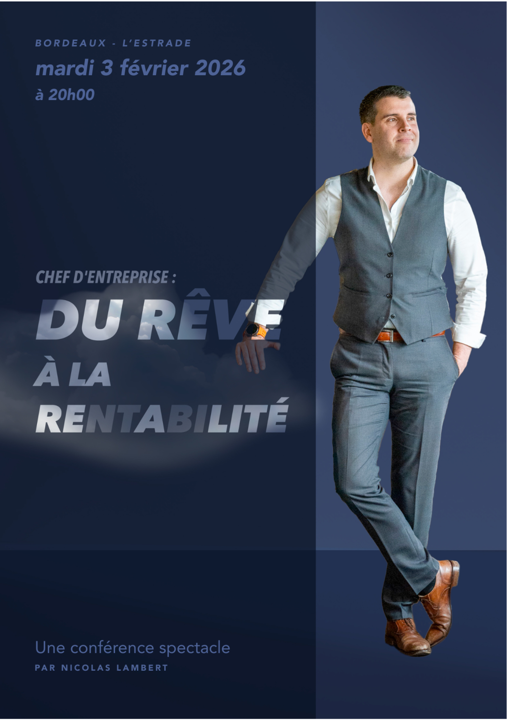 Dans ce seul-en-scène à mi-chemin entre stand-up et introspection, Nicolas raconte avec humour et vérité la vie (pas toujours glamour) d’un dirigeant.