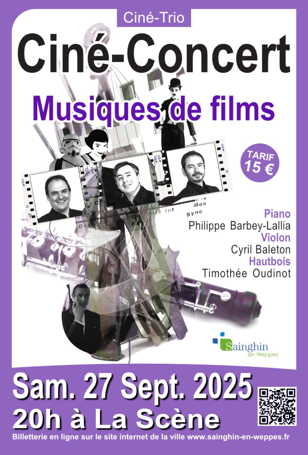Constitué de trois talentueux musiciens diplômés du Conservatoire National Supérieur de Musique de Paris, Philippe au piano, Cyril au violon et Timothée au hautbois, réunis autour de leur passion commune pour le cinéma, le Ciné-Trio compte à son répertoire près de 450 arrangements inédits de thèmes parmi les plus célèbres composés pour le cinéma, allant des films des années trente à nos jours.
