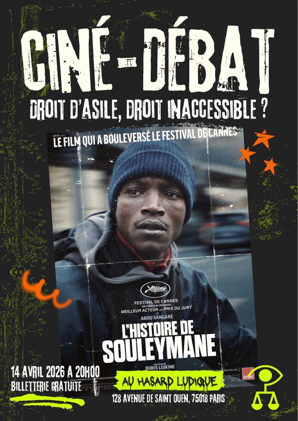 Projection du film L'histoire de Souleymane réalisé par Boris Lojkine suivi d'un débat autour de la thématique "Droit d'asile, droit inaccessible ?" en présence de professionnel.les du droit.Le Hasard Ludique, Avenue de Saint-Ouen, Paris, FranceDroit dans les Yeux