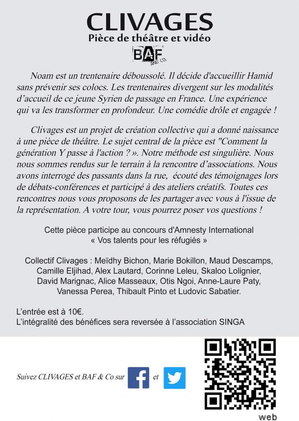 « Clivages » est un projet de création collective qui a donné naissance à une pièce de théâtre. Le sujet central est "Comment la génération Y passe à l'action ?" La pièce nous raconte l'histoire de 4 trentenaires face à l'arrivée d'une personne migrante au sein de leur colocation. S'ils sont tous d'accord pour aider, les modalités du passage à l'action sont sources de divisions.Traitée avec humour, la pièce met en scène les différentes facettes et interactions de personnages qui nous ressemblent. Qu'est-ce qui nous empêche d'agir ?