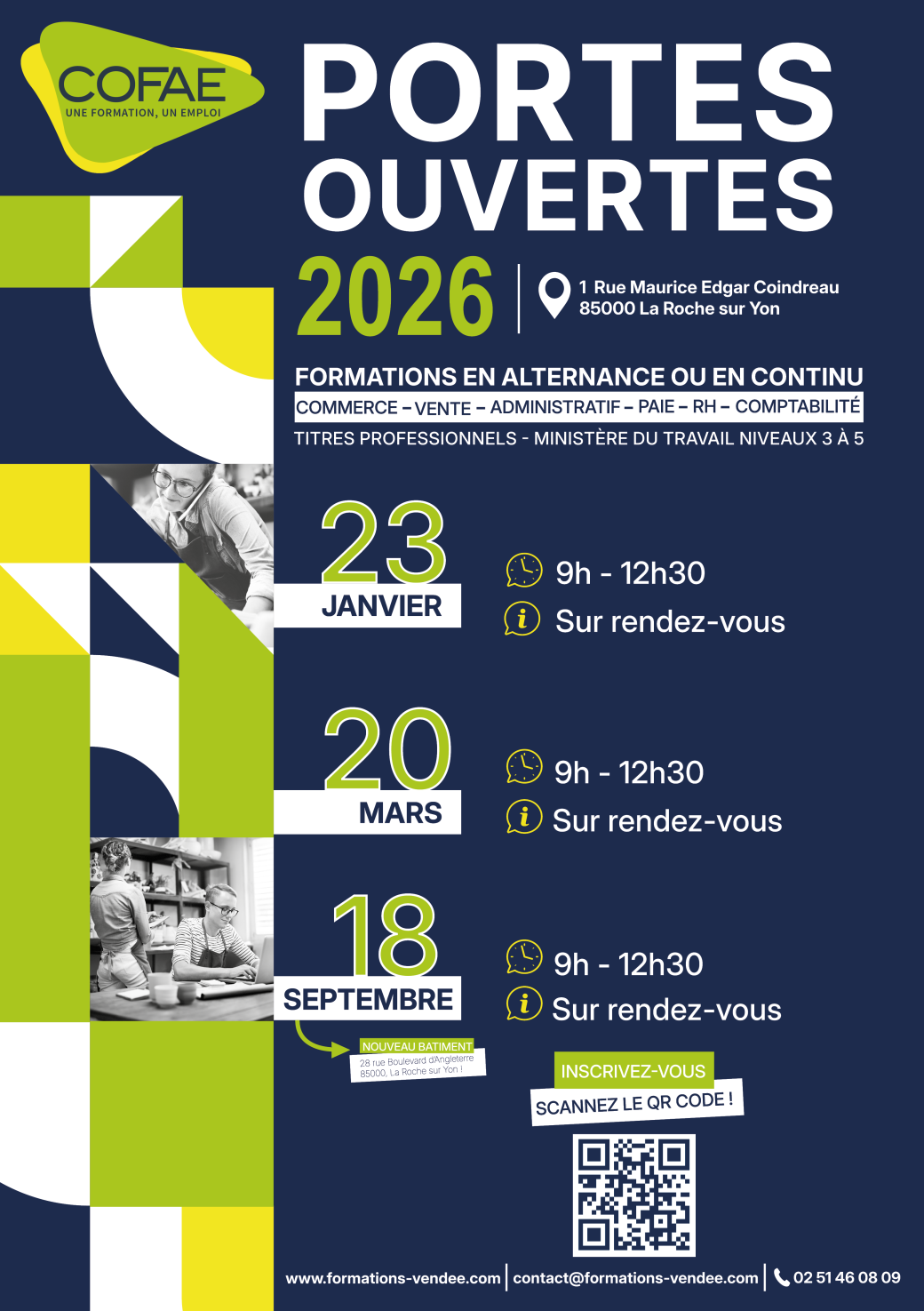 Vous aussi, vous souhaitez entreprendre un nouveau défi professionnel dans les métiers du commerce, de la vente, de la négociation, de la paie, de la comptabilité, du secrétariat ou du médical ? Alors venez nous rencontrer lors de nos portes ouvertes les 23 janvier, 20 mars et 18 septembre 2026 au COFAE (Veuillez faire défiler le calendrier pour sélectionner la date souhaitée). Cet événement sera l'occasion d'échanger avec notre équipe sur :
