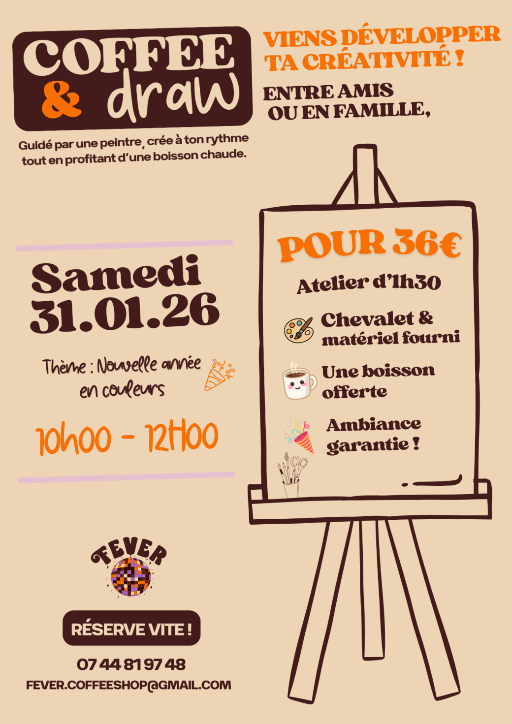 Pendant 2 heures, une peintre t’accompagne dans un atelier Coffee & Draw autour du thème “Nouvelle année en couleurs”. Que tu sois débutant·e ou déjà à l’aise avec les pinceaux, l’idée est simple : prendre du plaisir, créer à ton rythme et passer un bon moment.