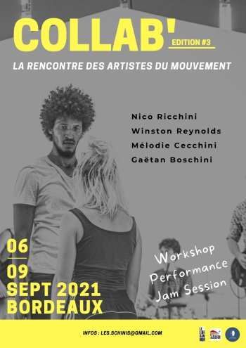 2021-09-06 10:00:00 2021-09-09 17:00:00 Europe/Paris COLLAB' Edition#3 Reservations on : https://www.billetweb.fr/collab-edition-3 -- WINSTON REYNOLDS | NICO RICCHINI | MÉLODIE CECCHINI | GAÉTAN BOSCHINIWorkshopSecret teacherSoirée «  Plein phare » sur une compagnie émergenteDance jam session « live music »6,7,8 & 9 Septembre 2020 | Bordeaux | Collabortion « Le stage de rentrée pour et par les artistes du mouvement. » Bordeaux, France LES SCHINI’S Company