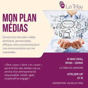 2024-05-31 09:30:00 2024-05-31 12:00:00 Europe/Paris COM' COM' - Mon plan médias Reserveringen op : https://www.billetweb.fr/com-com-mon-plan-medias -- Construire mon plan média pertinent, personnalisé, efficace, voire automatisé pour une communication qui me ressemble.   L’Atelier Up, c’est aussi rencontrer d’autres porteurs de projets et entrepreneurs avec qui échanger expériences, bonnes pratiques, anecdotes pour « être » en prenant soin de notre énergie; c’est aussi un moment de découverte et d’apprentissage par le « faire » pour soutenir le démarrage et le développement de notre activité pour « avoir » les résultats à la hauteur de nos rêves… « Être » pour « faire » et « avoir » est le fil d’or des Ateliers Up au service d’un entreprenariat responsable, créatif, agile et engagé ! La Tribu Co_Working, Rue du Docteur Leroy, Le Mans, France LA TRIBU CW