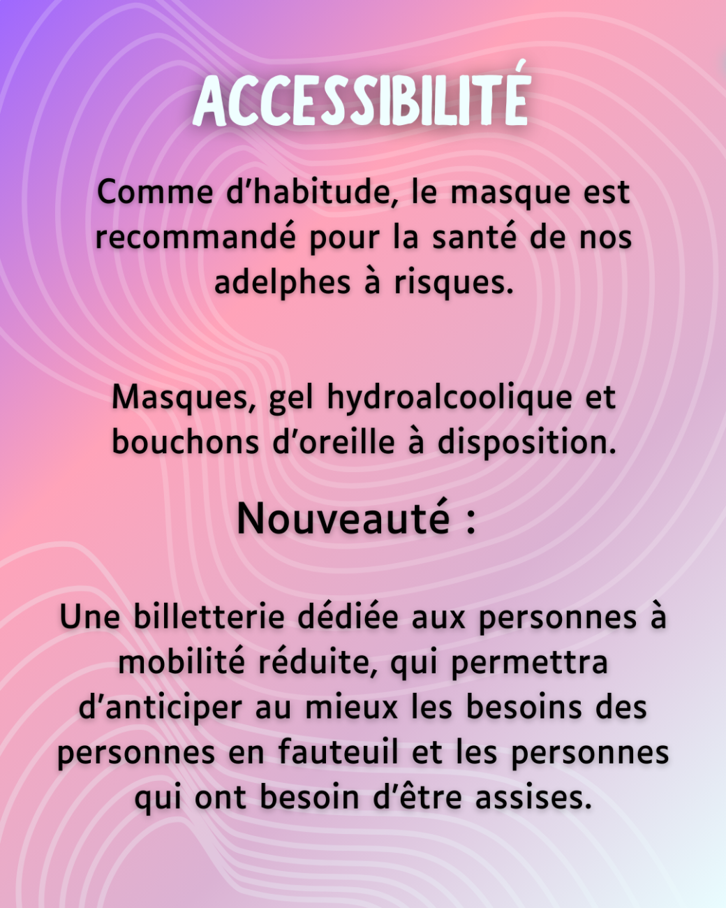 Evénement pensé pour accueillir les personnes à mobilité réduite (billets à réserver pour anticiper les besoins).