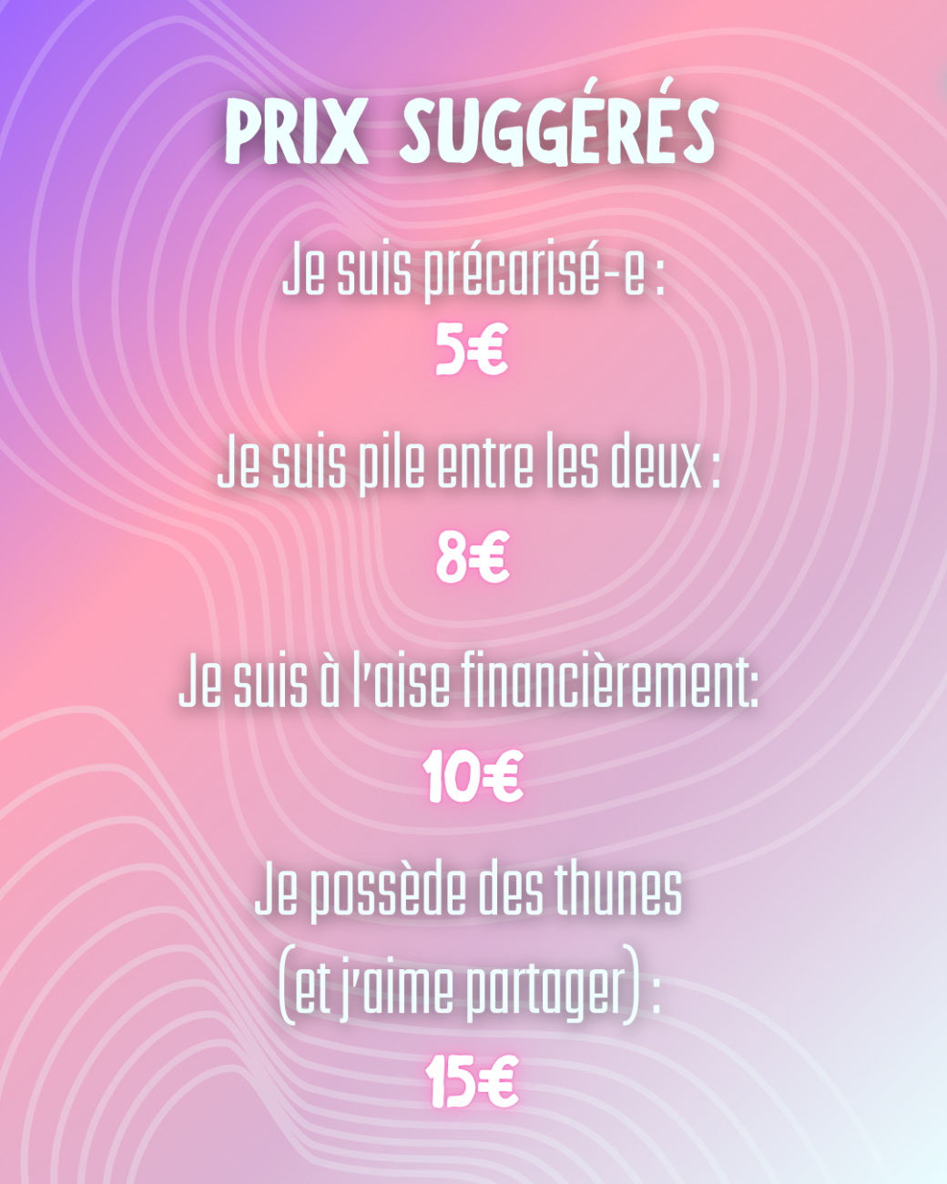 Comme d'habitude, cet événement sera à prix libre et conscient. Prix suggérés ci-dessous en fonction de vos moyens.