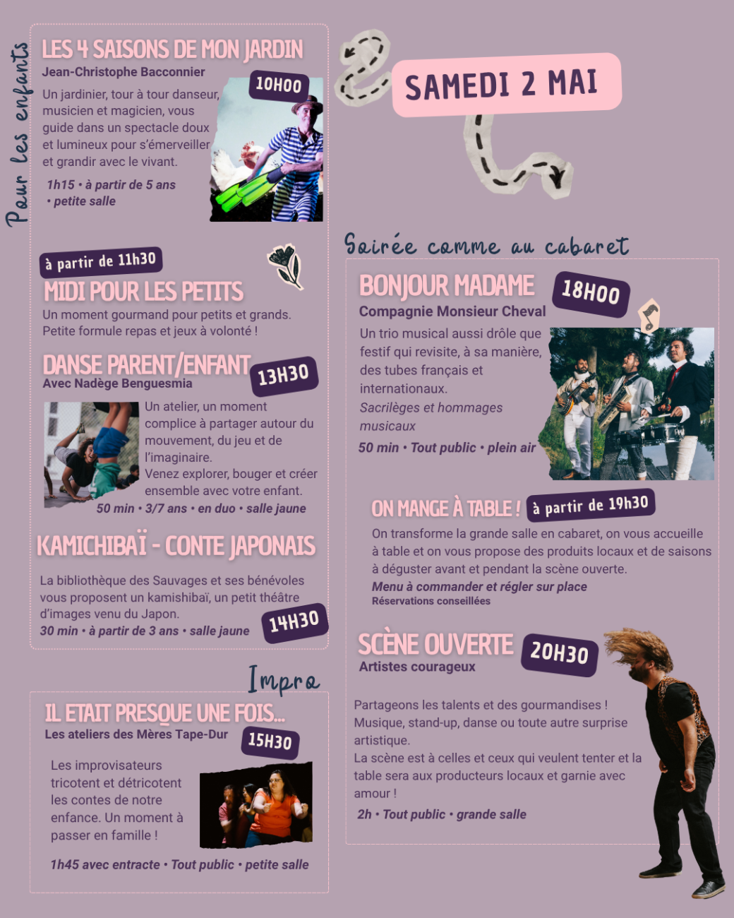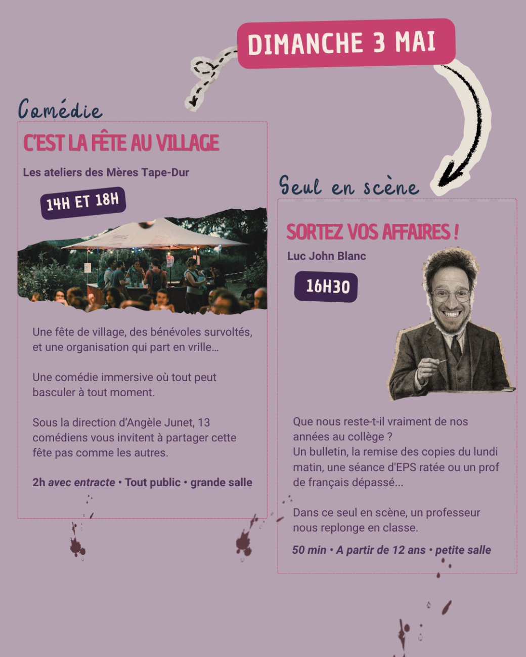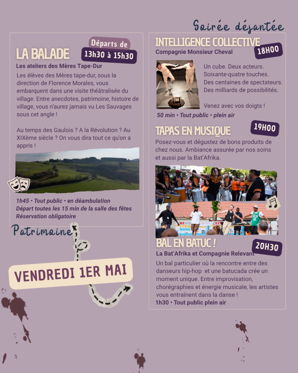 Du 1er au 3 mai 2026, la compagnie Les Mères Tape-Dur investit le site de la salle des fêtes des Sauvages pour lancer la première édition de « C’est comme la confiture ». Pendant trois jours, artistes amateurs, professionnels et public se retrouveront pour partager un week-end artistique, festif et convivial au cœur du village des Sauvages.