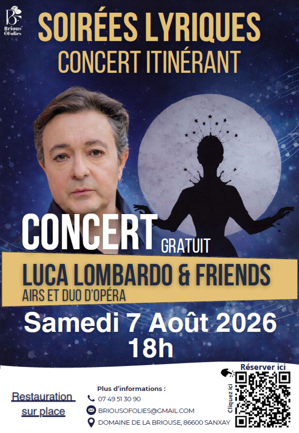 2026-08-07 19:00:00 2026-08-07 20:00:00 Europe/Paris Itinérance des Soirées Lyriques : Luca LOMBARDO & Friends Reservations on : https://www.billetweb.fr/concert-7-aout-2-26 -- Événement exceptionnel au Domaine de la Briouse !   En collaboration avec Les Soirées Lyriques de Sanxay, le Domaine de la Briouse est honoré de célébrer les 40 ans de carrière du ténor international Luca Lombardo.   Le 7 août 2026, venez vivre une soirée d’exception : Luca Lombardo interprétera, en solo et en duo, les plus grands airs d’opéra qui ont marqué son parcours et conquis les scènes du monde entier.   À cette occasion unique, le Domaine de la Briouse vous offre un concert gratuit en plein air, suivi d’un dîner champêtre dans un cadre naturel et chaleureux.   Une soirée magique, mêlant émotion, musique et convivialité, à ne surtout pas manquer ! DOMAINE DE LA BRIOUSE, La Briouse, Sanxay, France Domaine de la Briouse