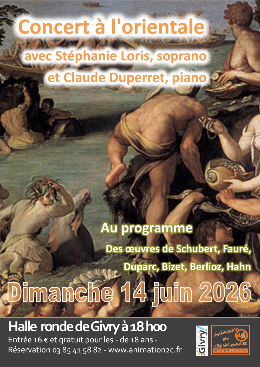 2026-06-14 18:00:00 2026-06-14 19:30:00 Europe/Paris Concert à l'orientale avec Stéphanie Loris, soprano et Claude Duperret, piano Reservations on : https://www.billetweb.fr/concert-a-lorientale-avec-stephanie-loris-soprano-et-claude-duperret-piano --  L’inspiration des musiciens a souvent fait quelques détours du côté de l’Orient. Ce concert donné par la soprano Stéphanie LORIS accompagné au piano par Claude DUPERRET, en donnera quelques illustrations avec des œuvres de Schubert, Fauré, Duparc, Bizet, Berlioz, Hahn. Ainsi le rêve oriental trouvera-t-il sa résonnance dans la voix humaine, si proche de toute émotion. Séphanie Loris s’initie à la musique dans son enfance par l’apprentissage du piano et, après une Maîtrise d’Économétrie, choisit de se consacrer entièrement à l’étude du chant.  Elle remporte le Premier prix Opéra du Concours International de Mâcon en 1999 puis intègre l’Opéra Studio de l’Opéra de Lyon pendant deux saisons consécutives, où on lui confie entre autres, les rôles de Rosita (Un mari à la porte d’Offenbach), Laurette (Le Docteur Miracle de Bizet), Guillemette (La Farce de Maître Pathelin de Barraud), Fé-an-nich-ton (Ba-ta-clan d’Offenbach), Elisetta (Le Mariage secret de Cimarosa), ou Berta (Le Barbier de S… Halle ronde, Place de la Halle, Givry, France Animation en Côte chalonnaise