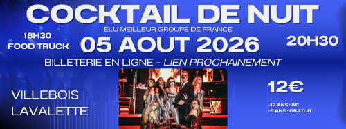 2026-08-05 18:30:002026-08-06 01:00:00Europe/ParisConcert Cocktail de Nuit Reservations on : https://www.billetweb.fr/concert-cocktail-de-nuit