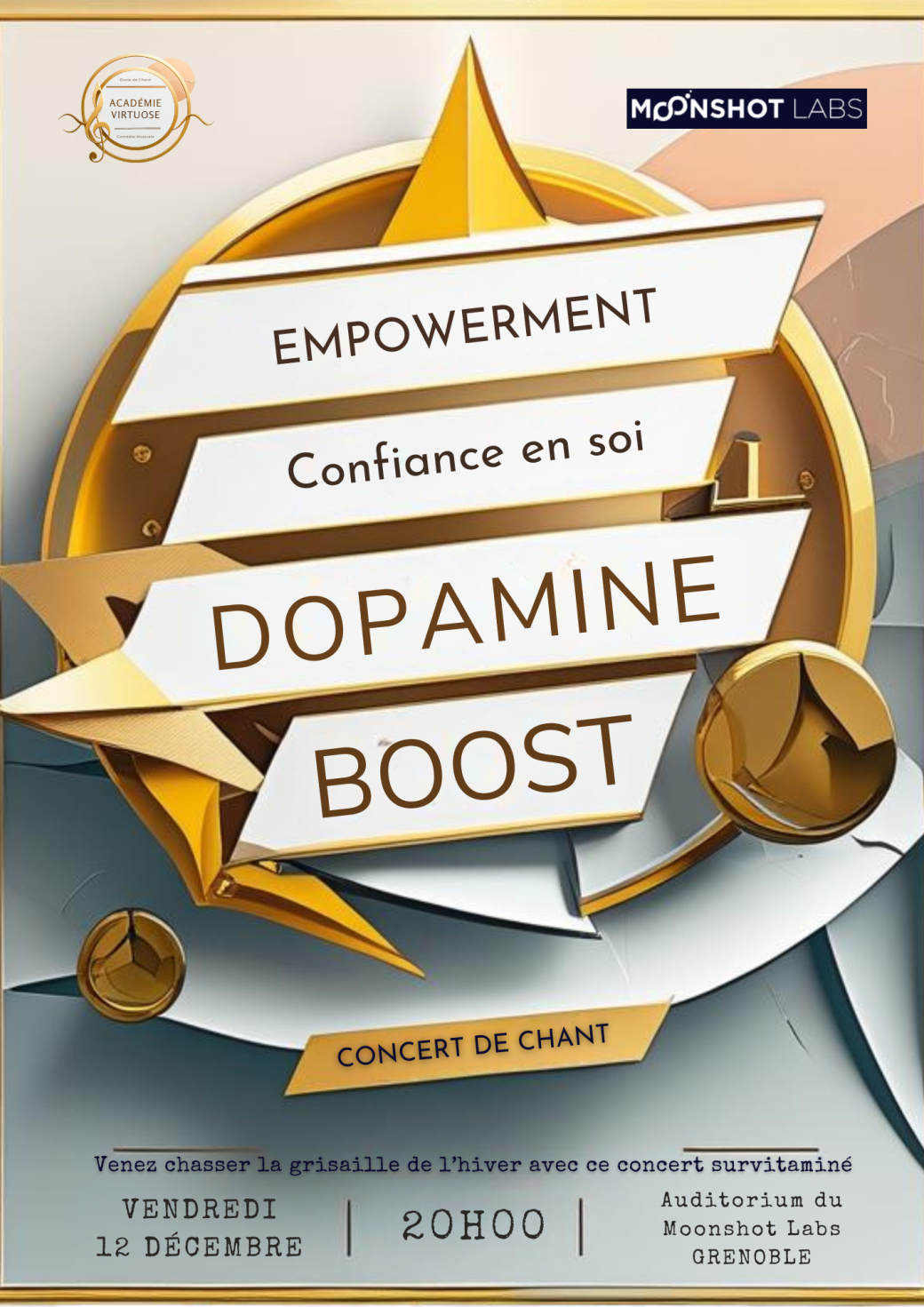 Et si, le temps d’une soirée, Vous faisiez grimper Votre taux de dopamine au lieu de Votre niveau de stress ? Le concert “Empowerment” de l’Académie Virtuose réunit des chansons qui parlent de force intérieure, de résilience, de confiance en soi… et de joie, tout simplement.