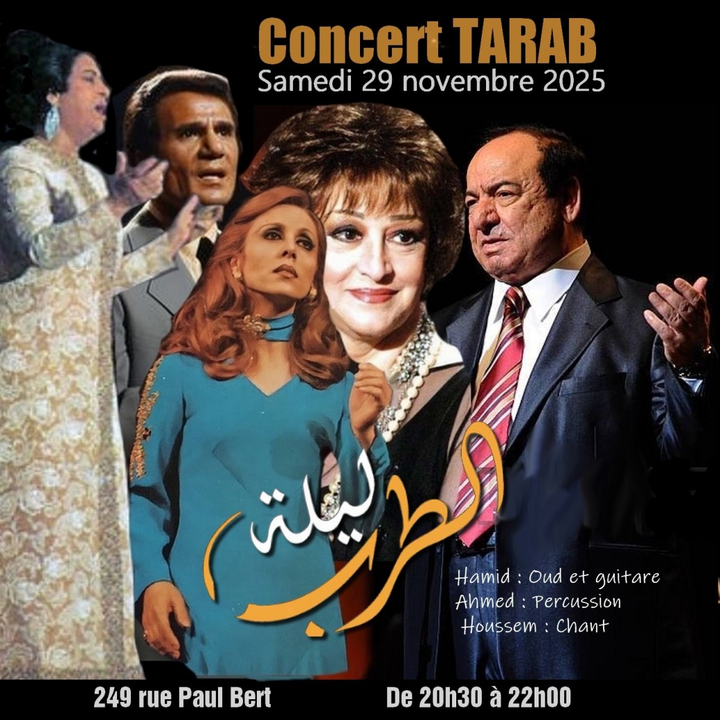 LYON : Concert Hommage aux Légendes du Tarab (Oum Kalthoum, Abdelwahab, abdelhalim et warda...) ! L'Association Almajlis vous a invité à revivre l'âge d'or de la musique arabe le Samedi 22 novembre 2025, de 20h30 à 22h00, au 249 rue Paul Bert (Lyon 69003). Tarif : 10€.