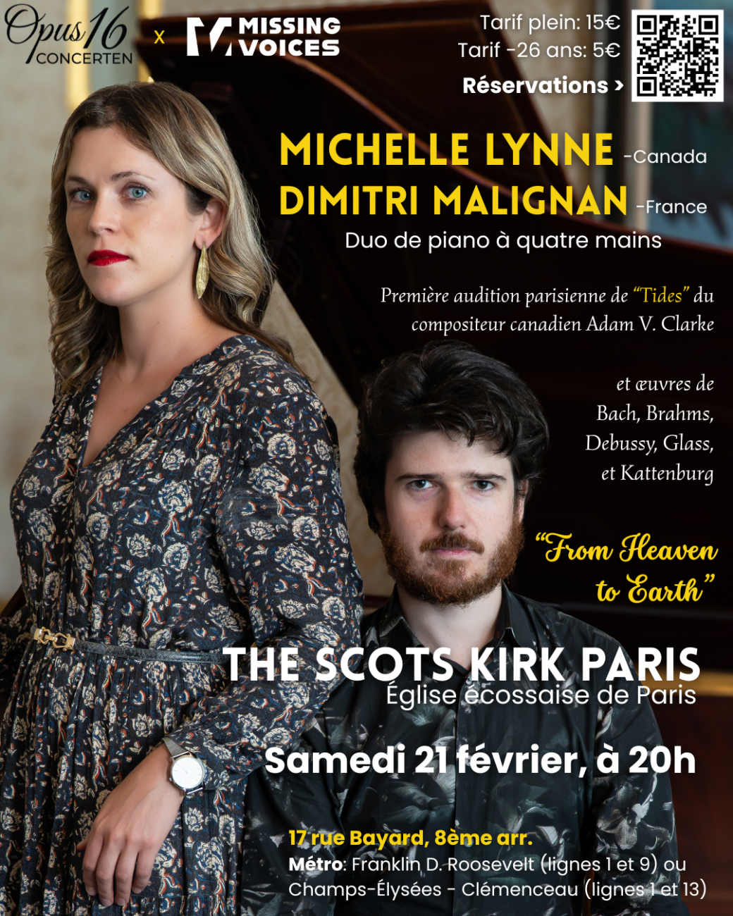 Retrouvez les pianistes Michelle Lynne (Canada) et Dimitri Malignan (France) pour un programme à quatre-mains exceptionnel, avec notamment une nouvelle œuvre du compositeur canadien Adam V. Clarke. Au programme également, des pièces de Bach, Brahms, Debussy, Philip Glass, et Dick Kattenburg.